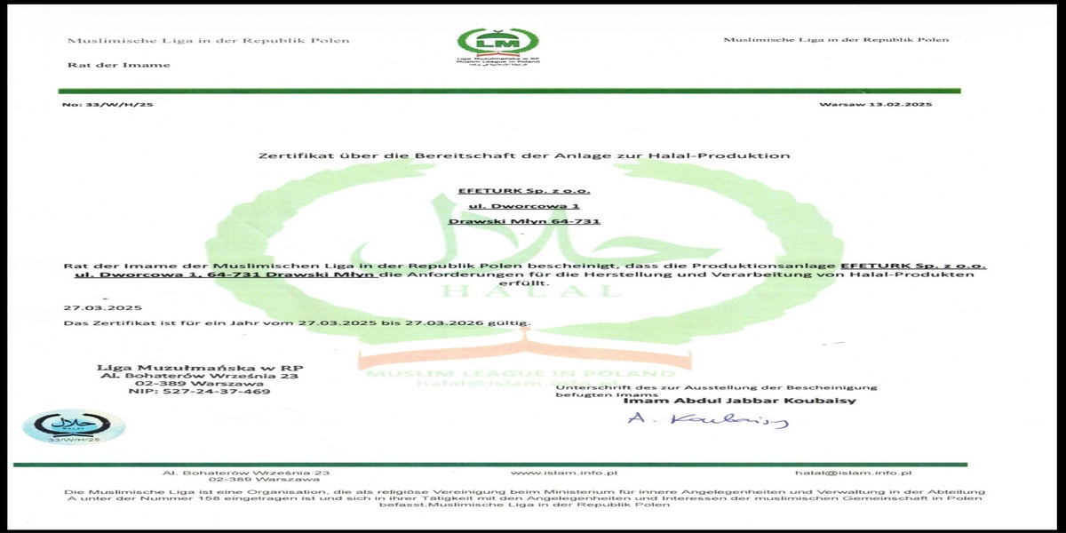 Wir legen größten Wert auf die Einhaltung strengster Halal-Standards. Unser gesamtes Sortiment ist zertifiziert und wird ausschließlich von sorgfältig ausgewählten, geprüften Lieferanten bezogen. Dies garantiert Ihnen nicht nur höchste Qualität, sondern auch ethische und religiöse Konformität bei jedem Produkt. Vertrauen Sie auf Frische und Reinheit, die Sie schmecken.
